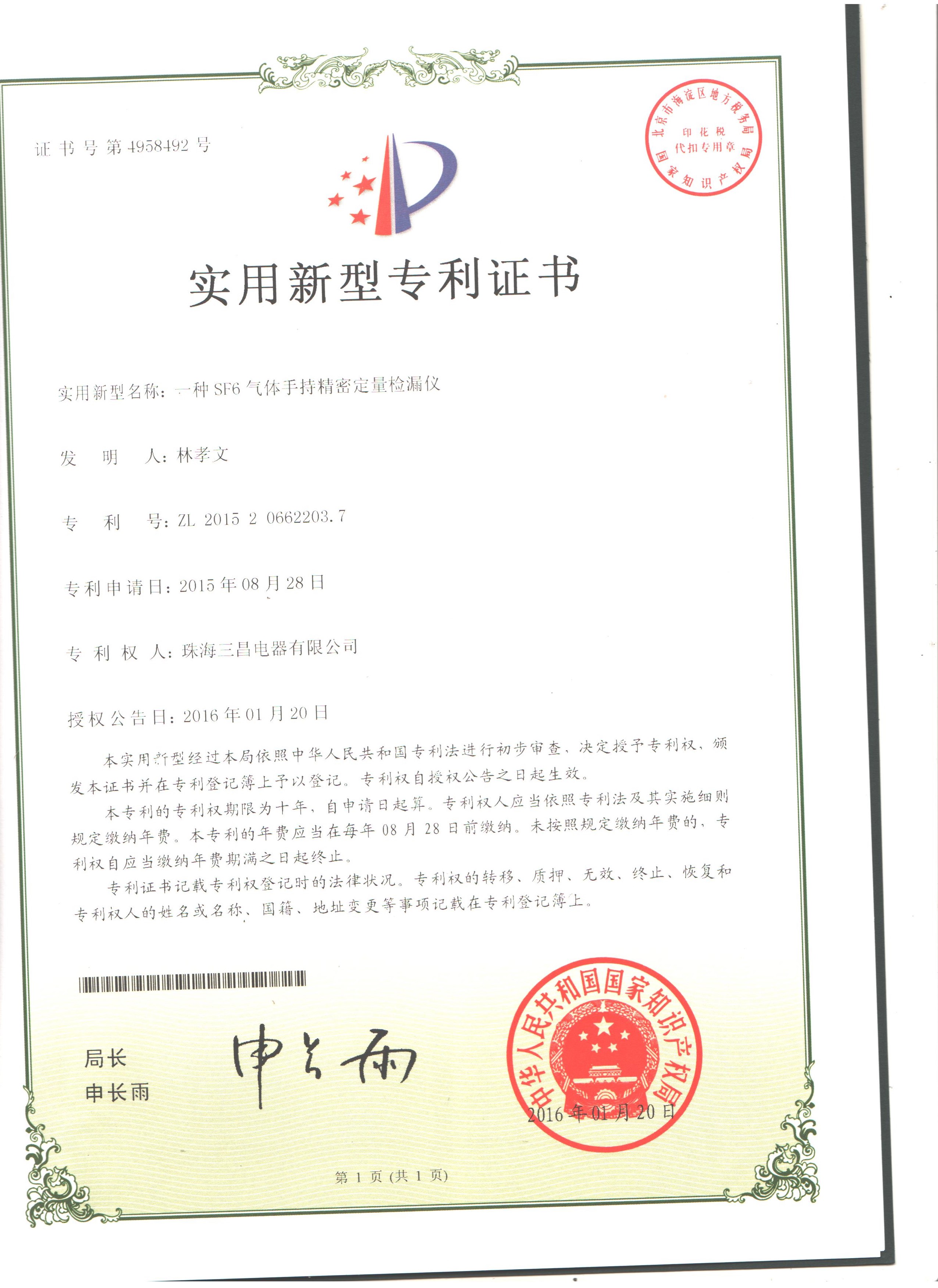 實(shí)用新型專利:一種SF6氣體手...