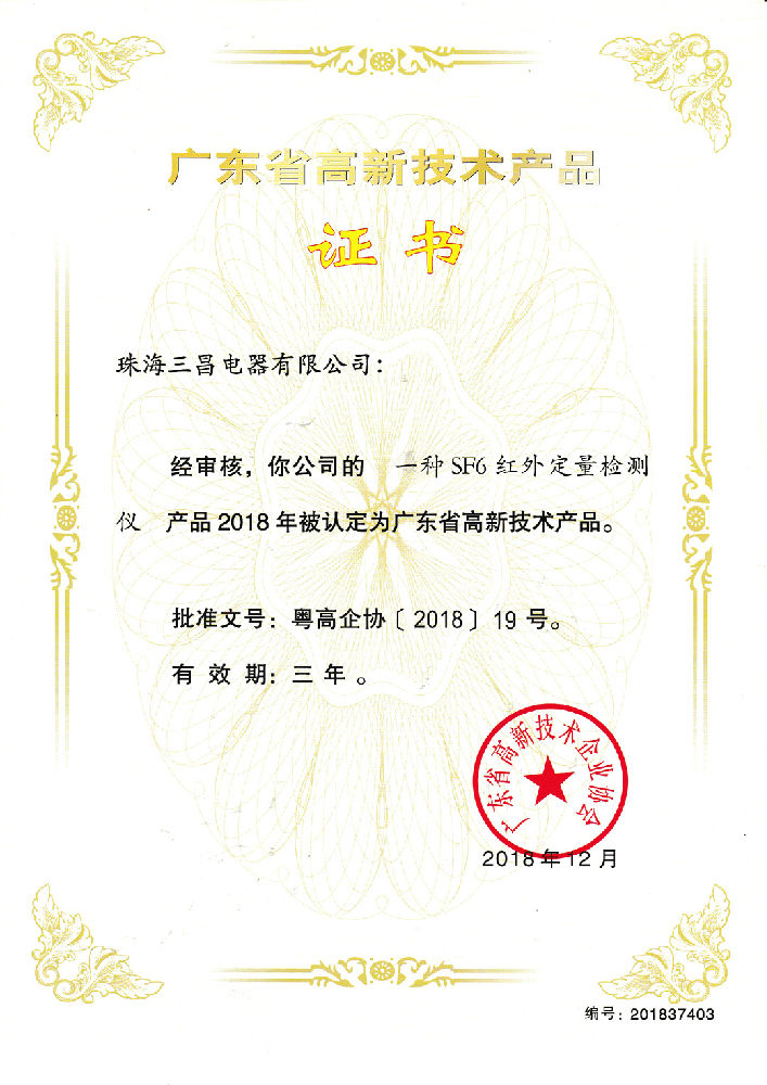 高新技術(shù)產(chǎn)品證書:SF6紅外定量檢測(cè)儀