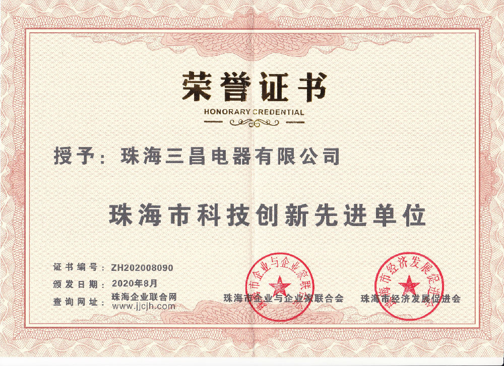 珠海市科技創(chuàng)新先進單位榮譽證書