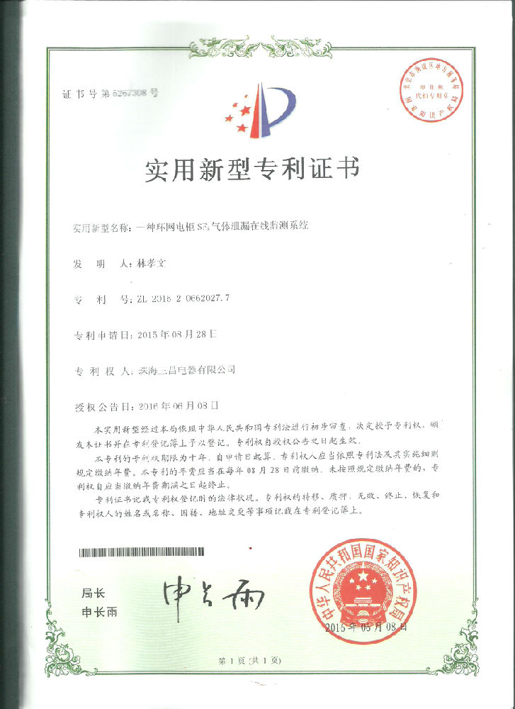 實(shí)用新型專利:一種環(huán)網(wǎng)電柜SF6氣體泄漏在線監(jiān)測(cè)系統(tǒng)
