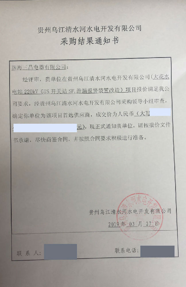 貴州清水河水電開(kāi)發(fā)有限公司中標(biāo)通知書(shū)