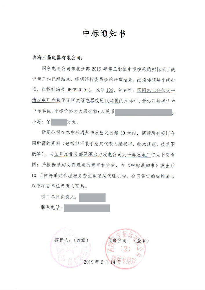 2019國(guó)網(wǎng)東北分部太平灣發(fā)電廠中標(biāo)通知書