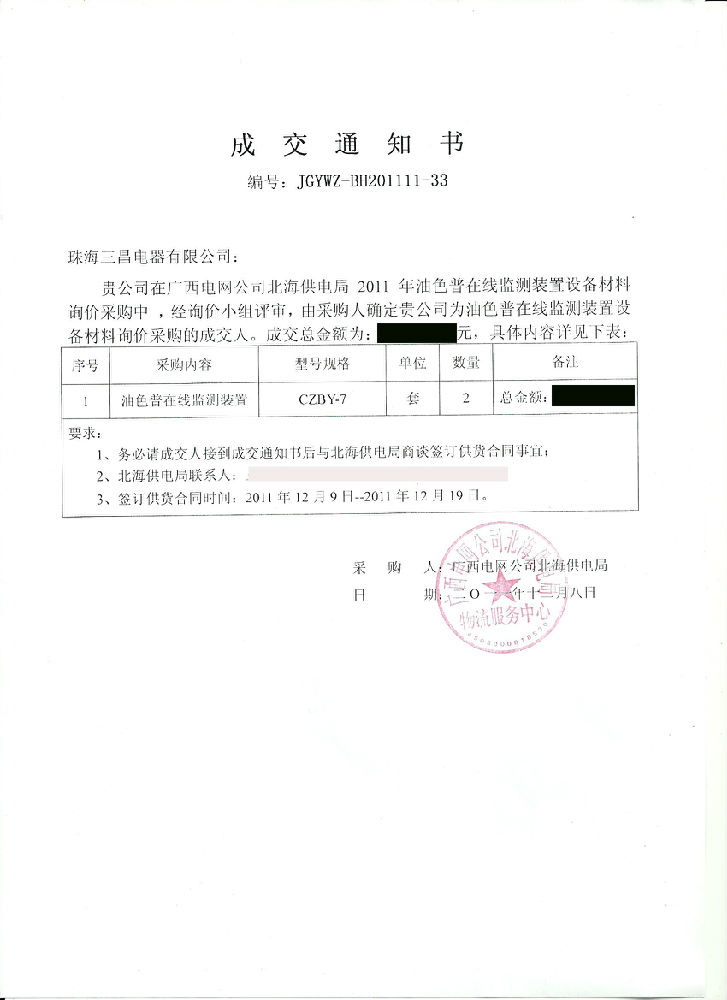 廣西電網(wǎng)北海供電局油色譜在線監(jiān)測中標通知書