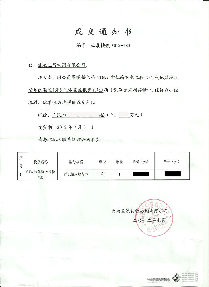云南電網(wǎng)公司昆明供電局中標(biāo)通知書(shū)