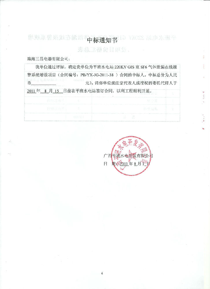 廣西平班水電站SF6在線監(jiān)測報警系統(tǒng)中標通知