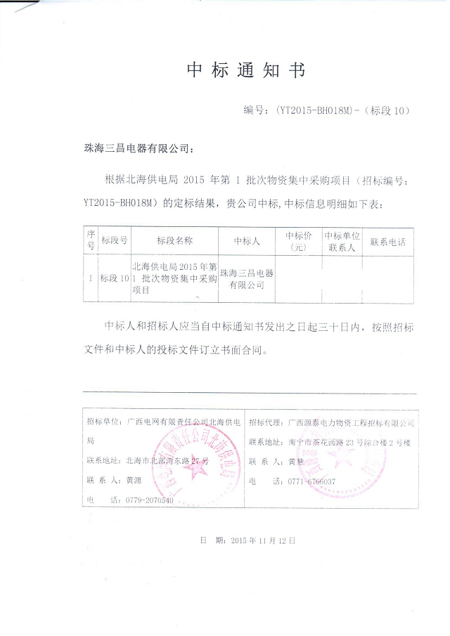 北海供電局2015年第1批次物資集中項目中標(biāo)