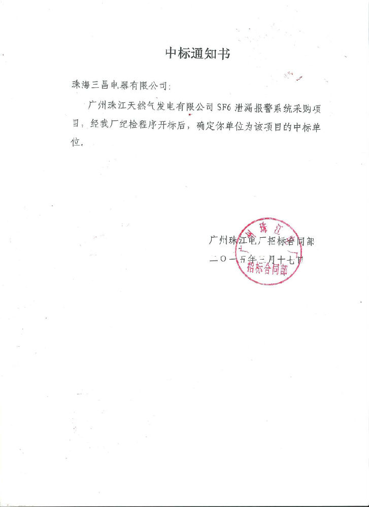 2015廣東珠江天然氣發(fā)電有限公司SF6在線監(jiān)測(cè)系統(tǒng)中標(biāo)通知書