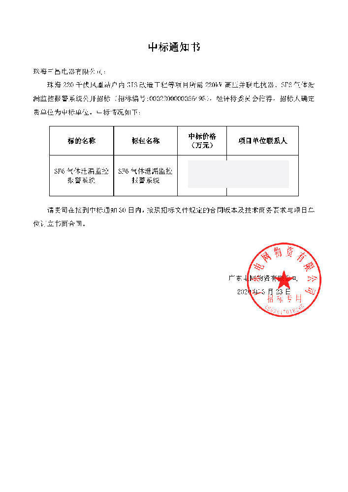 珠海220KV鳳凰變電站GIS室內(nèi)改造工程SF6在線監(jiān)測系統(tǒng)中標(biāo)通知書