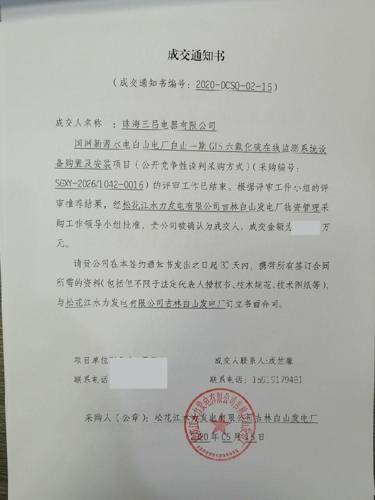 國(guó)網(wǎng)新源水電白山電廠SF6在線監(jiān)測(cè)系統(tǒng)中標(biāo)通知書(shū)