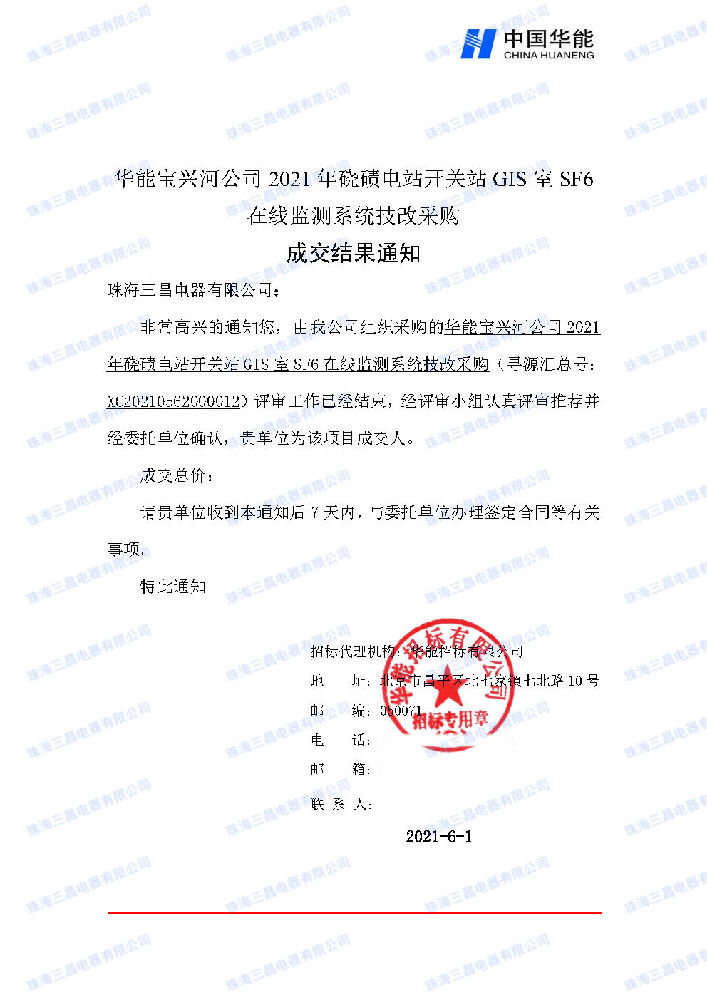 華能寶興河磽磧電站SF6在線監(jiān)測(cè)系統(tǒng)中標(biāo)通知書