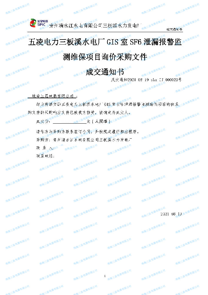 五凌電力三板溪水電廠SF6泄漏報警監(jiān)測維保項(xiàng)目成交通知書